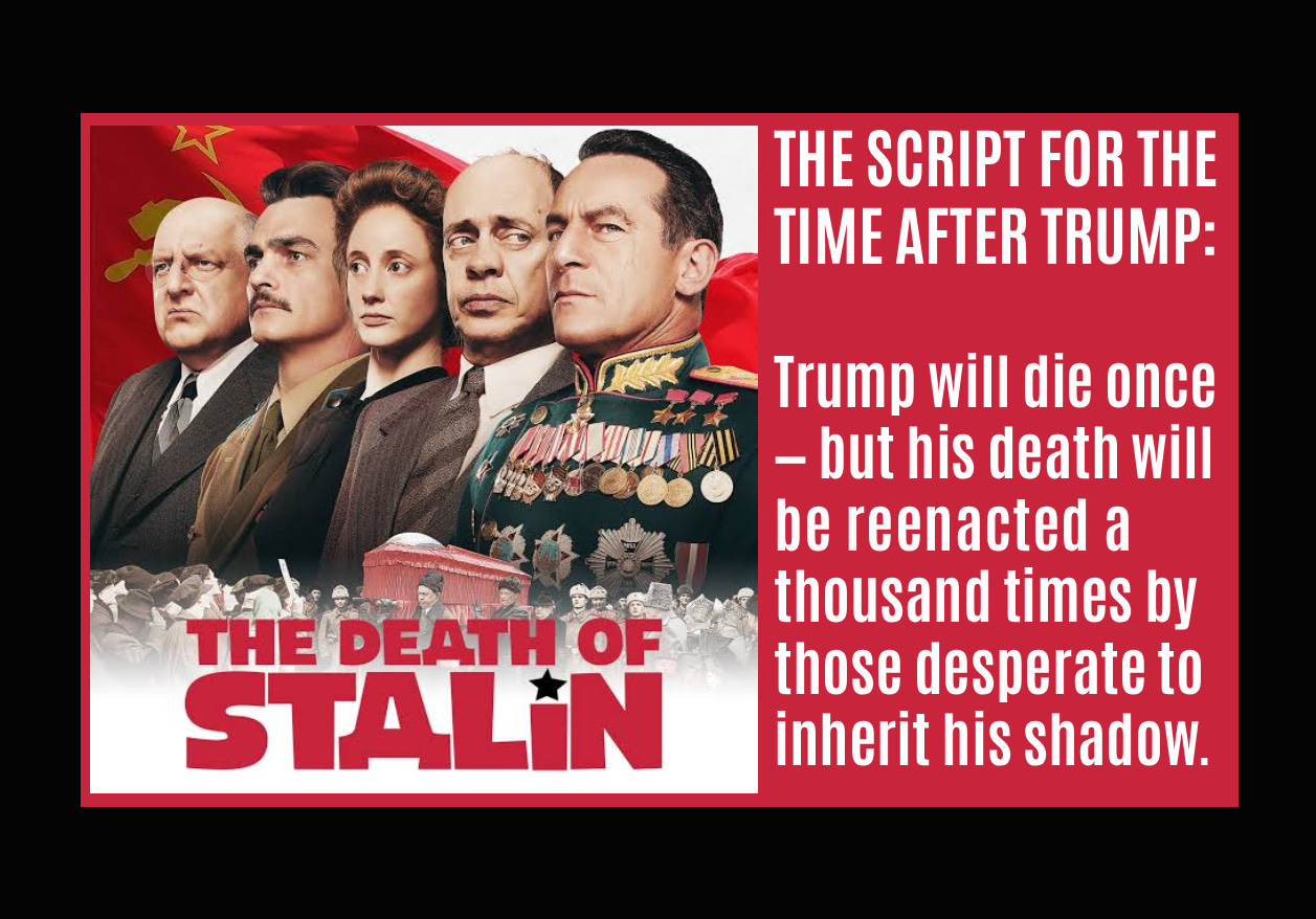 In The Death of Stalin, ministers argue over the dictator’s body while doctors, prisoners, and generals are used as disposable props in the performance of power. In Washington, expect the same: sycophants competing for inheritance rights, rivals leaking kompromat, children feuding over the golden calf, and media hagiographers producing a gospel before the embalming fluid has dried. Trump will not get a state funeral; he’ll get a blood sport, with Fox News as the ring announcer.